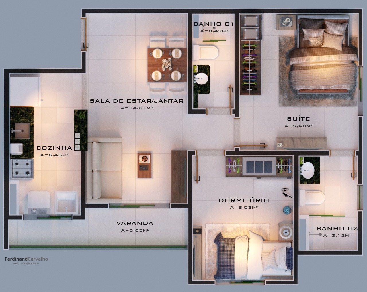 Os apartamentos possuem 55 m², com 2 quartos sendo 1 suíte, banheiro social, sala de estar/jantar, cozinha americana (ou normal), área de serviço e uma ampla varanda.